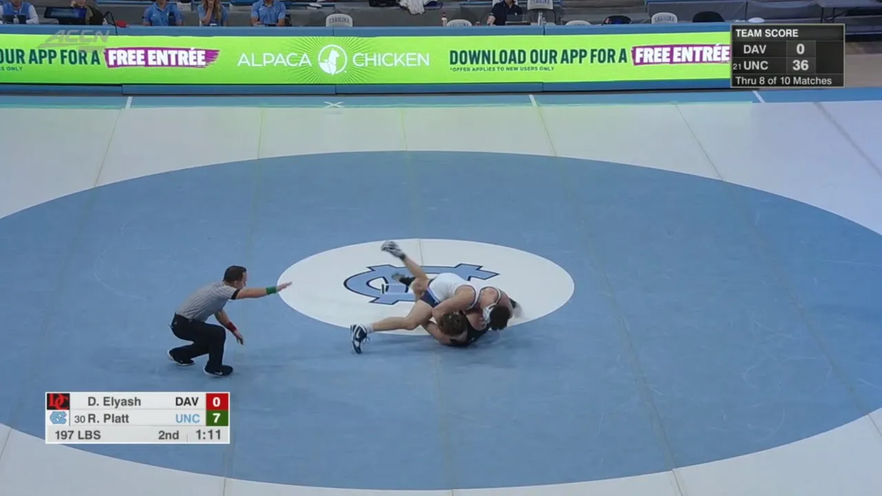 2025/26 North Carolina vs Davidson wrestling dual 197lbs 30 Robert Platt (UNC) tech fall Daniel Elyash (DC) I do not own this video, all credit/rights to ESPN/ACC