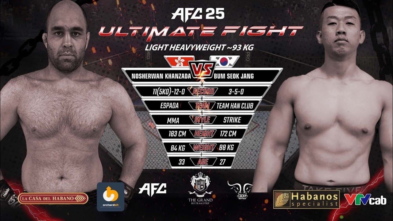 AFC25 일시 : 2023.6.10(SAT) 시간 : PM 20:00 ~ (한국시간) 장소 : 호짬그랜드 호텔 특설케이지 방송: AFC유튜브채널 / 베트남VTVCAP LIVE 1경기 : 라이트급 -70.4KG 뷰렌져릭 (76.8KG) VS 호드리고 카포랄 (77.16KG) 2경기 : 라이트헤비급 -93KG 장범석 (87.44KG) VS 노쉐르안 칸자다 (98.46KG) 1.90KG 체중오버 라운드당 -1점감점 / 리바운딩 5KG체중제한 / KO.TKO시 무승부 / 판정시패배선언 3경기 : 벤텀급 -61.3KG 최한길 (61.75KG) VS 펠리페 네고차들레 61.52KG 4경기 : 벤텀급 -61.3KG 후이황팡 (61.54KG) VS 왕하이따(60.44KG) 5경기 : 라이트급 -70.4KG *라이트급 잠정타이틀전 김의종 (70.66KG) VS 마존마나한 (70.66KG) 6경기 : 플라이급 -56.7KG *플라이급 타이틀전 레니카탈란주니어 (56.15KG) VS 홉슨올리베이라 (56.24KG) #최한길 #코리안좀비MMA #장범석 #팀한클럽 #김의종 #왕호프로모션 #AFC25 #VIETNAM #ANGELSFIGHTONGCHAMPIONSHIP #MMA #이종격투기 #격투기 #AFC #엔젤스파이팅 #엔젤스파이팅챔피언십 #KICKBOXING #타격 #입식타격 #킥복싱 #레슬링 #유도 #시합 #경기 #파운딩 #KO #난타전