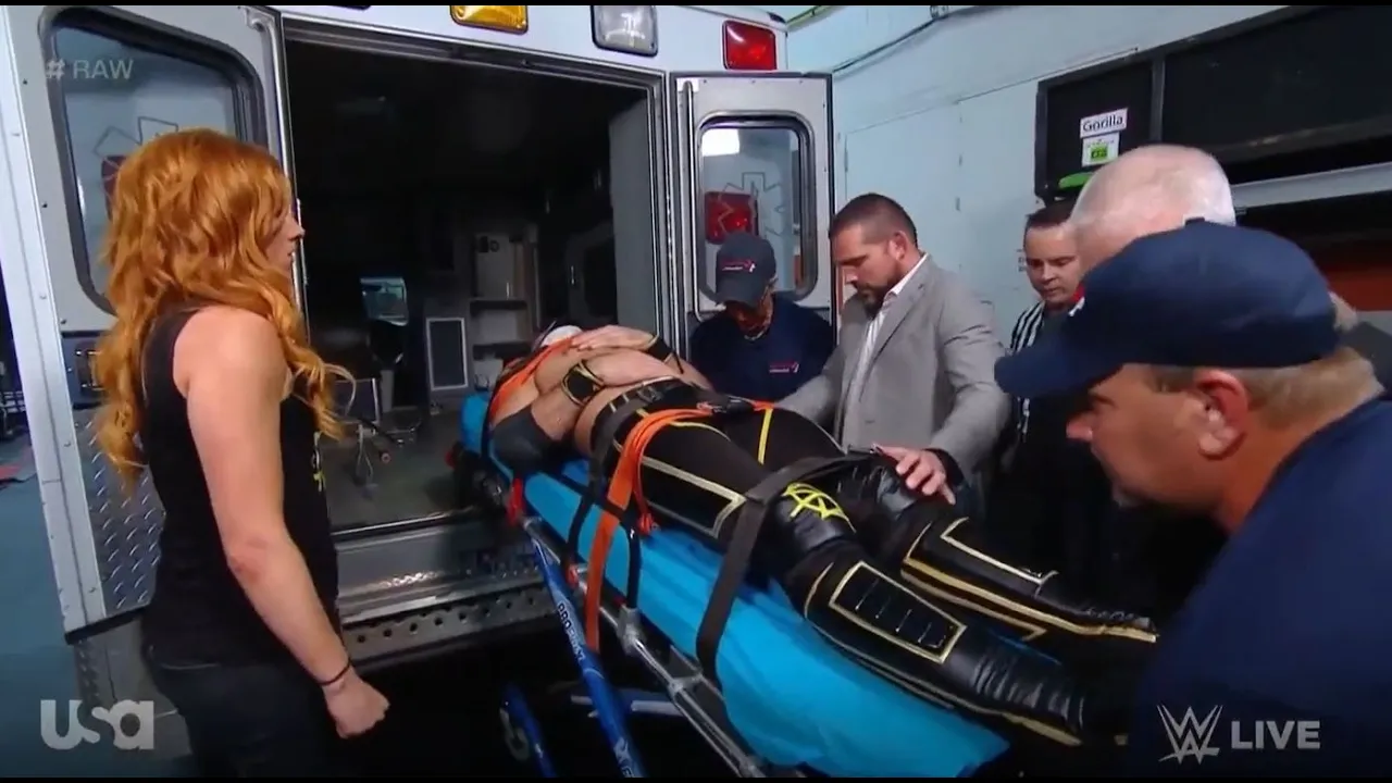 Becky Lynch And WWE Staff Help Seth Rollins To The Ambulance Raw 6/3/2019