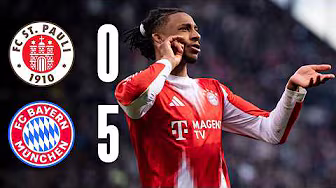 Goal-scoring record broken and lead at the top extended! FC Bayern secured a commanding 5-0 (1-0) victory away at FC St. Pauli on Saturday evening. Jamal Musiala (9th minute) gave Munich an early lead. In the second half, Leon Goretzka (53rd), Michael Olise (54th), Nicolas Jackson (65th minute), and Raphaël Guerreiro (89th minute) added to the score. With this away win, FCB extended their lead at the top of the table over second-place Borussia Dortmund to twelve points with five matchdays remaining in the season. The victory also gave Bayern a boost of confidence ahead of Wednesday’s Champions League quarterfinal second leg against Real Madrid. ► Wanna see more of Musiala, Olise, Kane & Co.? Subscribe now and hit the bell 🔔: https://fc.bayern/YouTubeAbo ► Du willst mehr von Musiala, Olise, Kane & Co. sehen? Abonniere uns jetzt und aktiviere die Glocke 🔔: https://fc.bayern/YouTubeAbo ► ¿Quieres ver más de Musiala, Luis Diaz, Kane y cía? Suscríbete ahora y activa la campana 🔔: https://fc.bayern/YouTubeAbo Instagram: / fcbayern TikTok: / fcbayern Facebook: / fcbayern Twitter: / fcbayern Snapchat: https://fc.bayern/FCBayernSnaps FC Bayern.tv PLUS: https://fc.bayern/PLUS Website: https://fcbayern.com FC Bayern.tv: https://fcbayern.com/fcbayerntv FC Bayern Newsletter: https://fc.bayern/newsletter_youtube