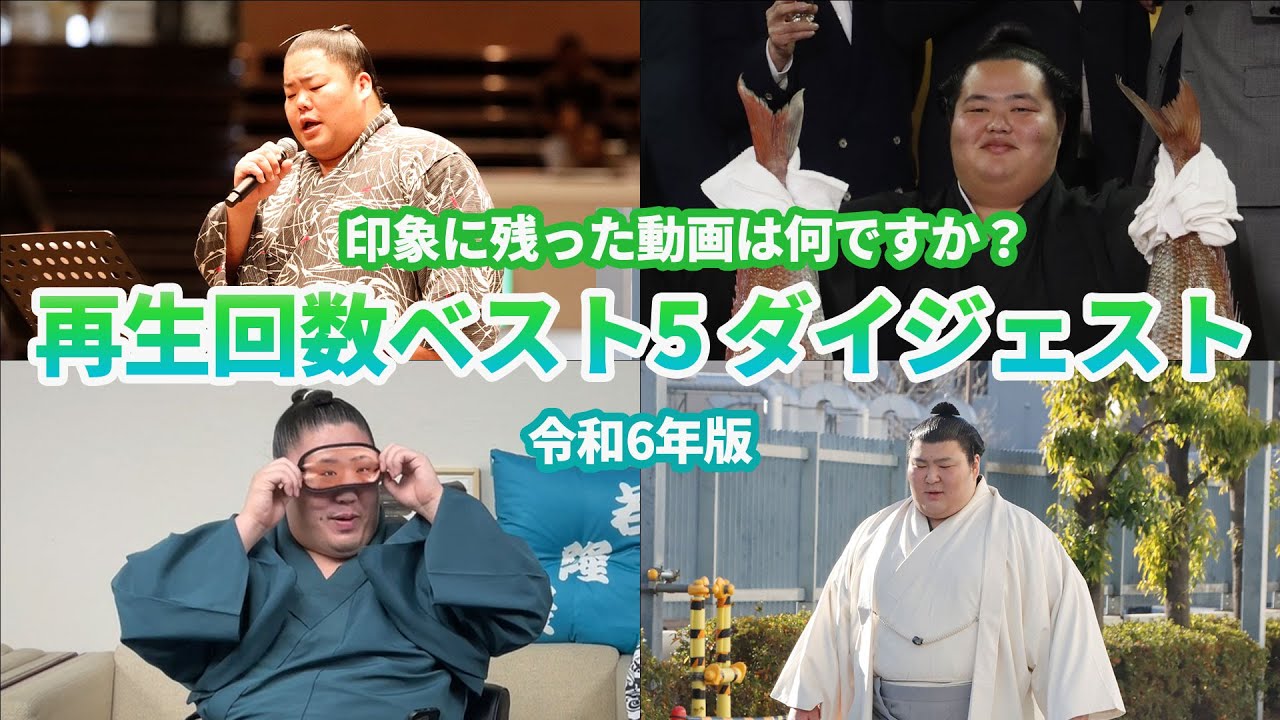 日本相撲協会公式YouTube上で、 令和6年に公開した動画で印象に残ったのはどれですか? 取組以外の再生回数上位5番をダイジェストでお届けします。 動画の詳細 1位:北陸に捧げる応援歌! お相撲さんが歌いました <能登半島地震復興支援・勧進大相撲>SUMO https://youtu.be/ZqekNVAK4sQ 2位:関取昇進!生田目・嘉陽 ー新十両記者会見ー SUMO https://youtu.be/ZnDhdVHOg9I 3位:琴ノ若 新大関昇進ダイジェスト SUMO https://youtu.be/sNSHvAp5qYc 4位:前代未聞!?私物紹介で想いが爆発! 一山本による若隆景グッズ紹介 SUMO https://youtu.be/dQVSr7PamaI 5位:全関取の場所入り Wrestlers making entry! <令和6年一月場所>SUMO https://youtu.be/pOm3U_qCKS8 今年も大相撲を応援いただき、ありがとうございました。 来年もよろしくお願いいたします。 🎦おすすめ人気動画リスト 三横綱豪華ゴルフ対決〈前編〉 ∟https://youtu.be/GlWSnPie3A8 三横綱豪華ゴルフ対決〈後編〉 ∟https://youtu.be/s-09GFnoMgY 握力横綱〈握力NO.1関取は誰だ!?〉 ∟https://youtu.be/iw20sVujqIo ラーメン二郎とちゃんこ鍋・禁断のコラボ ∟https://youtu.be/3Wzwxpyv4Jk 全関取の場所入り Wrestlers making entry! <令和6年一月場所>SUMO └https://youtu.be/pOm3U_qCKS8 ___________________________ 🤗おすすめ再生リスト 本場所・取組 ∟https://youtube.com/playlist?list=PLGbh7k1KcL3lhFq5rx4BK4XjuoSQMfo48 大相撲ゴルフ企画 ∟https://youtube.com/playlist?list=PLGbh7k1KcL3lZf1PMrjR8lqGJu8iaqk9q 相撲部屋(朝稽古) ∟https://youtube.com/playlist?list=PLGbh7k1KcL3kdjK_VNfjLWLXIQnLe_ore 人気動画切り抜きまとめ ∟https://youtube.com/playlist?list=PLGbh7k1KcL3lMjn-AckTj7Smr6R0jUqsk 【アーカイブ場所】初日無料! ∟https://youtube.com/playlist?list=PLGbh7k1KcL3kgzLvhiz4tBF1sQhFnYukI 親方ちゃんねる(対談、インタビューも) ∟https://youtube.com/playlist?list=PLGbh7k1KcL3nbFptlOMrnOuv0X98orxbH ___________________________ #相撲 #歌ってみた #sumo ___________________________