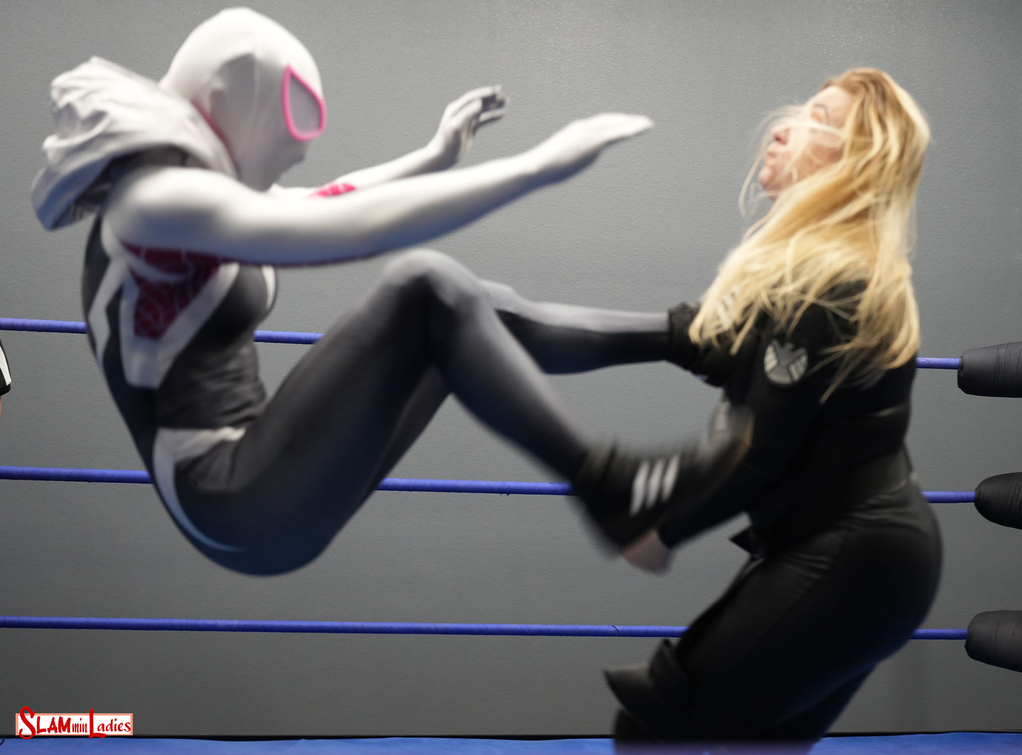 Shot to a customer's specifications-2 camera shoot with emphasis on 1 competitor. Cosplay Arachnids face off as Spider-Gwen takes on Black Widow in a fun, action-packed contest featuring multiple cameras to capture all the action. The Widow easily tosses the web slinger to the canvas before threatening to crush the little bug. The angered Skye responds with a running Clothesline and a follow up Dropkick, but eats a brutal Spear before being buried in the corner with a series of shoulderblocks! Kimber delivers a stunning jawbreaker, drops Skye on her head with a belly to back Suplex, and chokes out Spider-Gwen with her own hood to take control. Daredevil Zoey throws herself at Kimber with a crossbody off the second rope and sends her flying across the ring with a Hurricanrana, but Skye pays the price for her high-risk offense as she goes face first into Kimber’s boot on a top rope splash attempt. Kimber capitalizes with a stalled Vertical Suplex, spinning heel kicks and a spinebuster slam! Like her comic book counterpart, Zoey can absorb tremendous punishment, but even heroes have their limits. Can Skye recover and tap into her spider powers, or will Black Widow wrap up yet another victory?