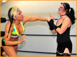 It’s fast-paced technical wrestling at its finest when Leva matches up with Tracy Taylor. These two evenly matched wrestlers spend much of this one fall battle reversing and creatively escaping from each other’s armbars, Hammerlocks and tests of strength (And Leva’s not afraid to grab a handful of hair when that helps her cause). There’s also a particularly impressive test of strength midway through the match. Tracy uses a Side Headlock takedown, Armdrag, a Bodyslam, Hiptoss, a one-legged Boston Crab and Chinbreaker in an attempt to get the win. The always exciting Leva fires back with a Headscissors, leg sweep takedown, shoulder blocks in the corner, an Abdominal Stretch and a modified X-Factor. The back-and-forth match ends when one wrestler is whipped off the ropes and comes back with a Crossbody block for a 2 count then follows up with a Sleeperhold that leaves her opponent out cold in the center of the ring. When they met in SLAMpeg 382, Leva pulled out the victory. Will Tracy even the score this time or will Leva come out on top again?