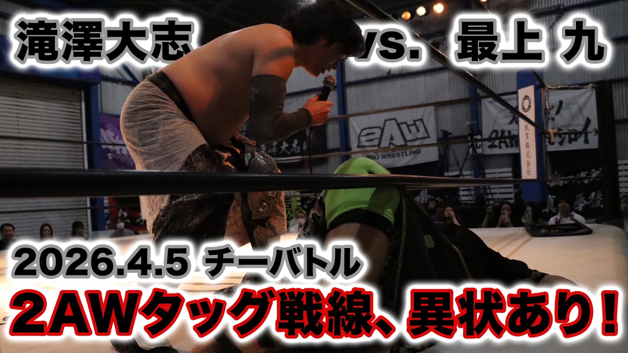 こちらの動画の試合情報はこちら↓ 【大会名】チーバトル254 【日程】2026年4月5日(日) 【場所】千葉・2AWスクエア ★第4試合[2AWタッグ前哨戦 30分1本勝負] 最上九 vs. 滝澤大志 2AWタッグ王者組(2026年4月17日現在)真霜拳號&最上九と挑戦者組 滝澤大志&若松大樹の2AWタッグ選手権試合は、2026年4月19日(日)13時開始の『有限会社山﨑工業プレゼンツ GRAND SLAM in TKPガーデンシティ千葉』で開催! 詳しくは2AW公式WEBサイトをご覧ください!! https://www.2aw.jp/ ★2AWオフィシャルオンラインショップはこちら!→https://2awstore.myshopify.com/ ★2AW公式HP→ https://www.2aw.jp/ ★ほぼ毎週末にチーバトルを開催!2AWスクエアへのアクセスは → https://www.2aw.jp/access/ ★2AW公式Twitter→ https://twitter.com/2awoffice ★2AW公式Instagram→https://www.instagram.com/2aw_official/