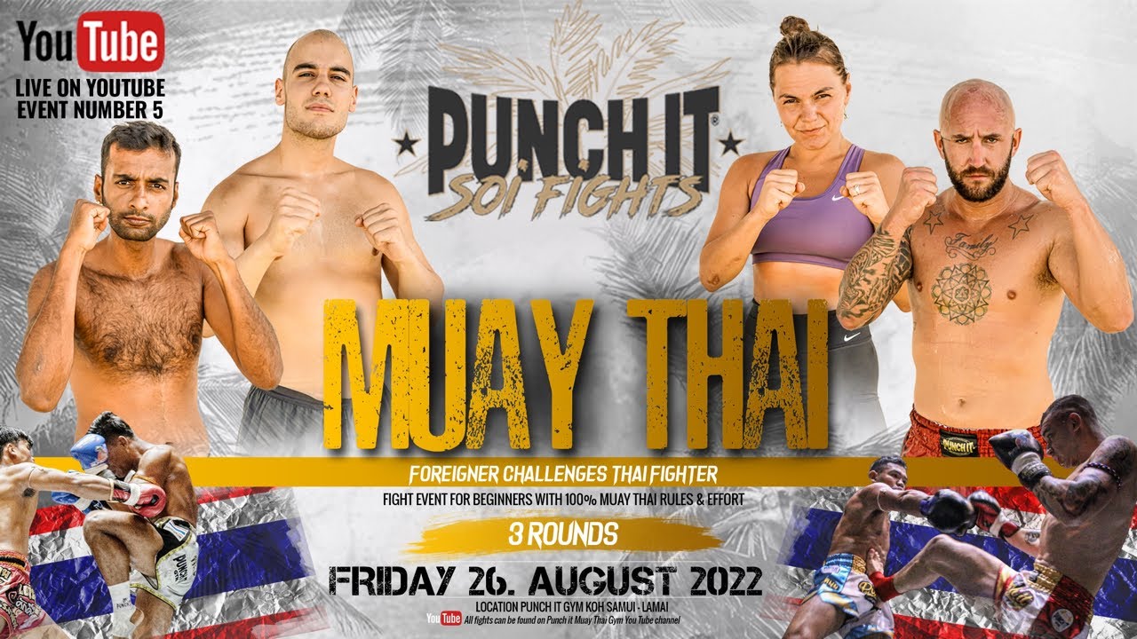 the 5 round of the Punch it Soi fights eveant for beginners take a place in August 2022 at the Punch it Muay Thai Gym in Koh Samui Thailand. 3 x 3 Round full Muay Thai ruls with a Thai boxing fighter. △BOOKING You can book the Muay Thai camp on our website https://www.punchitgym.com/accommodation We look forward to your visit and hope to welcome you to Koh Samui soon. LET’S CONNECT US TO #onemuaythaifamily △ Web: https://www.punchitgym.com △ Facebook: https://www.facebook.com/punchitgym △ Instagram: https://www.instagram.com/punch_it_gym_thailand △ TikTok: https://www.tiktok.com/@punchitgym △ Twitter: https://twitter.com/punchitgym △ Web Shop: https://www.punchit.shop