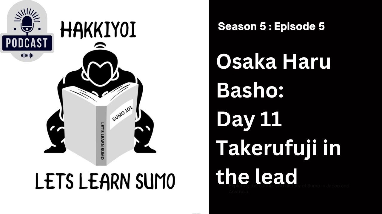 Lets Learn Sumo - Osaka Haru Basho Day 11 - Takerufuji takes a 2 bout lead by beating Ozeki Kotonowaka Apple Podcast Spotify Instagram X (The Symbol formerly known as Twitter)