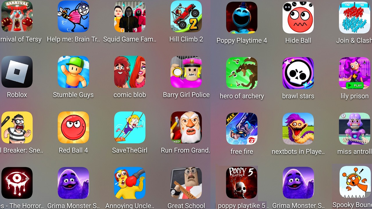 Roblox,Poppy Playtime 5,Run From Grandpa,Great School Breakout,Eyes The Horror,Escape The Carnival..