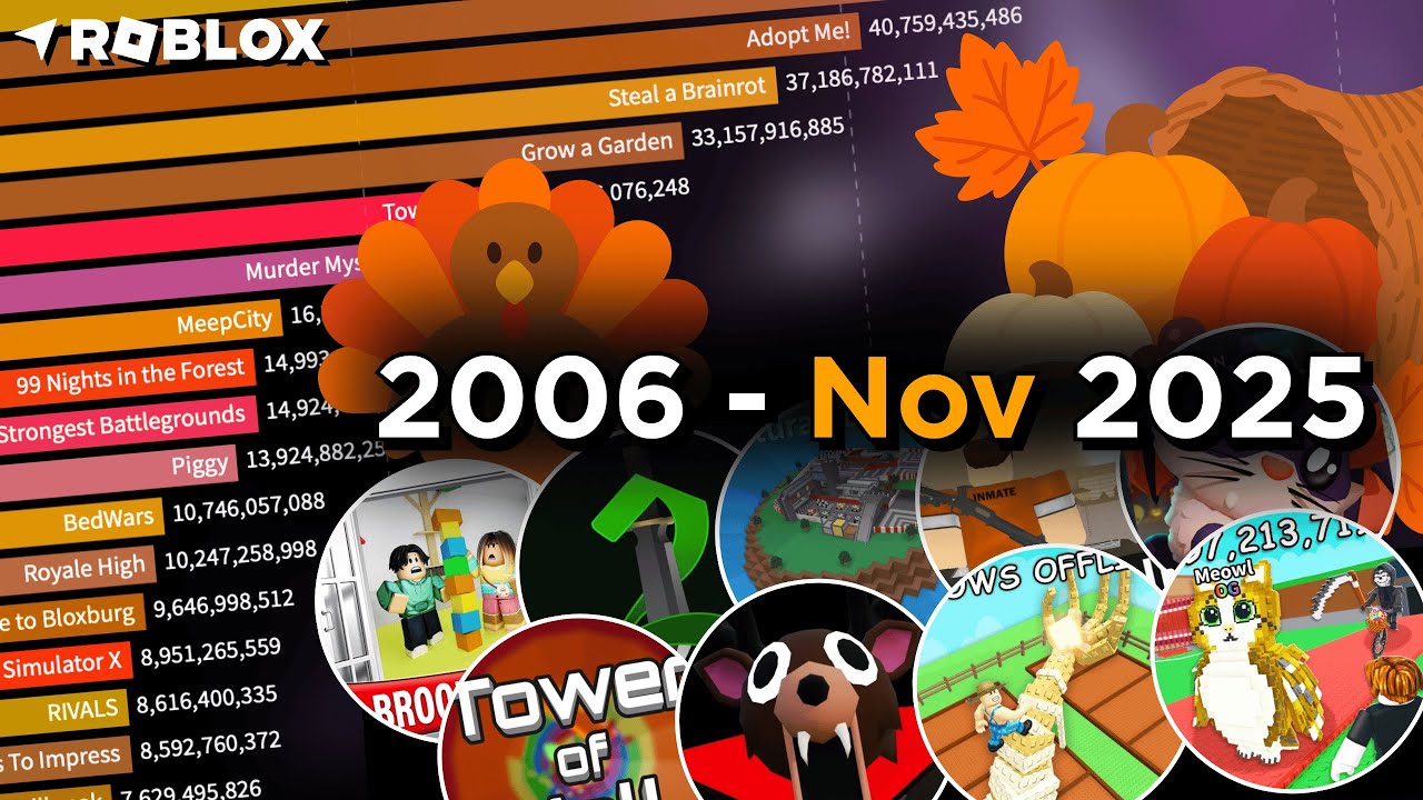 The Most Played Roblox Games (2006 - November 2025) Video shows the most played Roblox games in terms of total visits. Hope you enjoy the video! [the number is the visits total] - - - - - - - - - - All of the content shown in this video is owned by Enzomazing. The music belong to their owners! This video does not intend to cause harm or controversy to the topics mentioned. This video is purely for entertainment only! - - - - - - - - - - Join the discord please!! - https://discord.gg/TtpMkAZbYY - - - - - - - - - - Music links: https://youtu.be/wmgrnv0-oUc https://youtu.be/I_ZD2cdhaKU https://youtu.be/mAZYH-h_SsY Music credits: Track: Tetrix Bass Feat. Veela - The Light [NCS Release] Music provided by NoCopyrightSounds. Watch more NCS on YouTube: https://NCS.lnk.to/YouTubeAT Free Download / Stream: https://ncs.io/TheLight Track: Rameses B & Veela - Never Knew Me [NCS Release] Music provided by NoCopyrightSounds. Watch more NCS on YouTube: https://NCS.lnk.to/YouTubeAT Free Download / Stream: http://ncs.io/NKM Track: ROY KNOX & CRVN - The Other Side [NCS Release] Music provided by NoCopyrightSounds. Watch more NCS on YouTube: https://NCS.lnk.to/YouTubeAT Free Download / Stream: http://ncs.io/RKC_TOS - - - - - - - - - - Data source: Wayback Machine, Rolimons - - - - - - - - - - Programmes I use to make videos: https://flourish.studio [data visualization] https://obsproject.com [recording software] https://www.canva.com [thumbnails & layouts] https://www.blackmagicdesign.com//davinciresolve [editing software] - - - - - - - - - - Have fun, and spread the =) #roblox #youtube #statistics -- Enzomazing