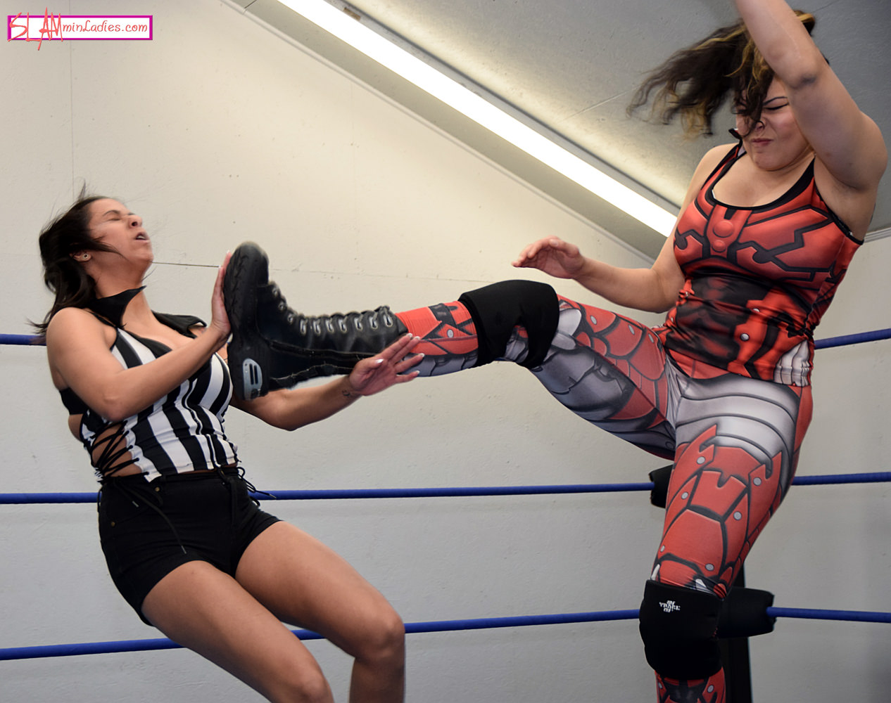 Following the events of SLAMpeg 3001, Amanda seems set to once against officiate a match with Vanessa. However, before a second wrestler arrives, Vanessa finds an opponent of her own – Amanda. Seeking payback for Amanda’s previous lack of impartiality, Vanessa takes the referee down with a big boot and in less than a minute, Amanda is out for the count. Unfortunately, the absence of a referee (a conscious one, at least!) means there is nobody to tell Vanessa that the match is over. Vanessa spends the next 5 minutes continuing to dish out the punishment to her already knocked out rival. Amanda is literally putty in Vanessa’s hands, as a Full Nelson and Camel Clutch do nothing to wake Amanda from her slumber. Vanessa finally leaves Amanda still sleeping in the ring, her lesson well learned.