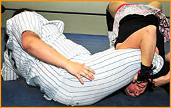 A handicap match undergoes a change to become a No Disqualifications Match when Jessie McKay shows up injured. She stays ringside to cheer on tag team partner Madison against the much larger Betsy. Betsy mocks the injury and seems confident that she'll defeat Madison. Perhaps taking a cue from the injured wrestler, Betsy targets the leg of Madison and pushes things to the limit to maim the limb. Using ropes, ring posts, chairs and good old fashioned wrestling tactics she soon has the Aussie in danger of losing match and mobility. When Jessie tries to save her partner from further hurt, she's dispatched quickly by the giantess and, unfortunately, has provided yet another weapon to damage her partner's limb. The ruthless Ruth is maniacal in her attack and leaves both Australian grapplers injured and screaming!