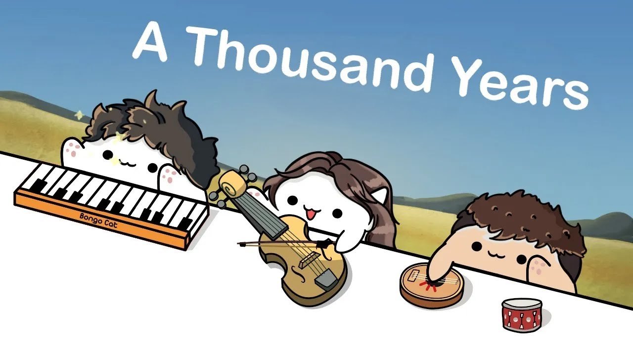 Bongo Cat - A Thousand Years (Cover Version) 🎧 Original Song: https://youtu.be/rtOvBOTyX00 Meower: Kirine IG: @kirine.me YT: @negakirine Music Producer: VBK | IG: https://www.instagram.com/thephuongvbk0510/ Music Arranger: DuyNH | FB: https://www.facebook.com/duyduynguyen111 Mix Master DHTM: https://www.facebook.com/profile.php?id=100014960254565 Merch ▶ http://bit.ly/BongoCat-Merch Subscribe Bongo Cat ▶ http://bit.ly/BongoCat_Subscribe Facebook ▶ https://www.facebook.com/BongoStudioVN Instagram ▶ https://www.instagram.com/bongocat.studio/ Copyright/Claims/Issues: bongocat.studio@gmail.com Hashtag: #bongocat #AThousandYears #meow