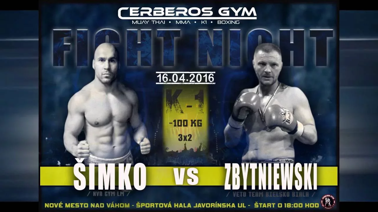 Cerberos Fight Night - Matej Simko (NVR Gym LM) vs Sebastian Zbytniewski (Veto Team Bielsko-Biala Poland) K-1 3x2min -100Kg 16.04.2016 Nove Mesto nad Vahom Slovakia