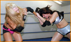 It quickly becomes apparent that neither of these grapplers is afraid to break the rules. After all, an armwringer is much more devastating while biting your opponent's fingers. And what's a Headlock without some hairpulling? For all the cheating that's going on, there's a lot of technical wrestling too. Both talented wrestlers exchange Surfboards, Headscissors, Front Facelocks and double underhooks (among others). Lacey scores with a flying knee to the back of Rain, but still it's Rain who scores the first fall after an inverted Spinning Neckbreaker. Infuriated, Lacey rallies and hits an Implant DDT to even the score. This one goes all the way, and in Fall 3 it's anyone's ballgame. The final submission is forced after a Full Nelson Bomb is turned into an excruciating Lotus Lock.