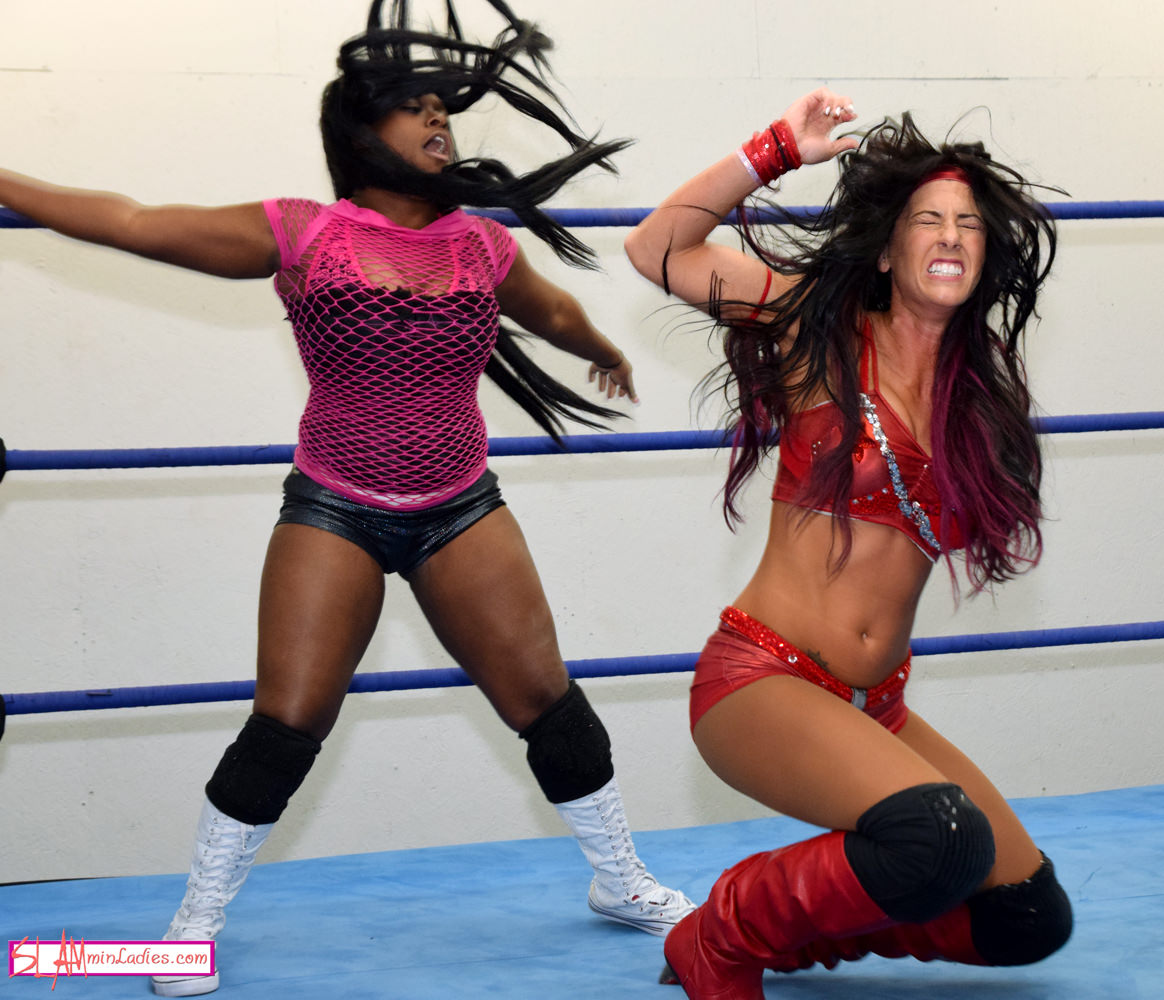 No time is wasted as these two eager grapplers start circling each other in anticipation. Santana strikes first, slipping in behind Latasha for a back-mounted Sleeper and hanging on desperately as she tries to put her opponent away early. Latasha runs Santana backwards into the corner to break the hold and unloads on the brunette beauty, choking her out with her boot and laying into her with forearms, kicks and punches. Latasha brings an intensity to the battle that’s almost frightening to behold. Santana’s efforts to fight back only enrage her opponent more as Latasha blitzes Santana with a continuous pummeling, slamming her face first to the canvas, clamping on a grinding Camel Clutch and crushing her in the corner with devastating splashes. Santana suffers a tremendous pounding including fishhooks, nose pulls, blatant chokes on the ropes and vicious boot grinds. A tight Sleeper puts the brunette out, but Latasha isn’t done! Unfortunately for Santana this one isn’t over and Latasha’s eyes burn red as she hauls Santana’s limp body into a Bearhug to try extracting a submission from her broken opponent.