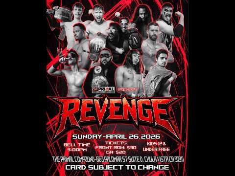 Primal Pro Wrestling Presents PRIMAL REVENGE A bi-weekly pro wrestling show out of San Diego California. Next show Sat May 9th at the Primal Compound 657 Palomar St. Chula Vista, CA 91911