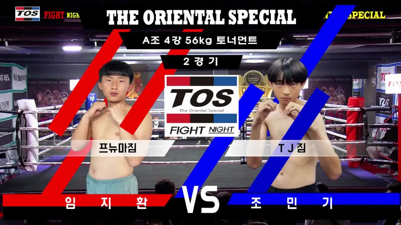 T.O.S Kickboxing Fight Season 1. 2022.11.26 locale : Korean,busan / TJ GYM SPECIAL HALL. T.O.S kickboxing [-56KG 4강 2경기] 임지환(2006年生 /프뉴마GYM ) 조민건(2008年生/TJ GYM / 부산 용문중학교1학년
