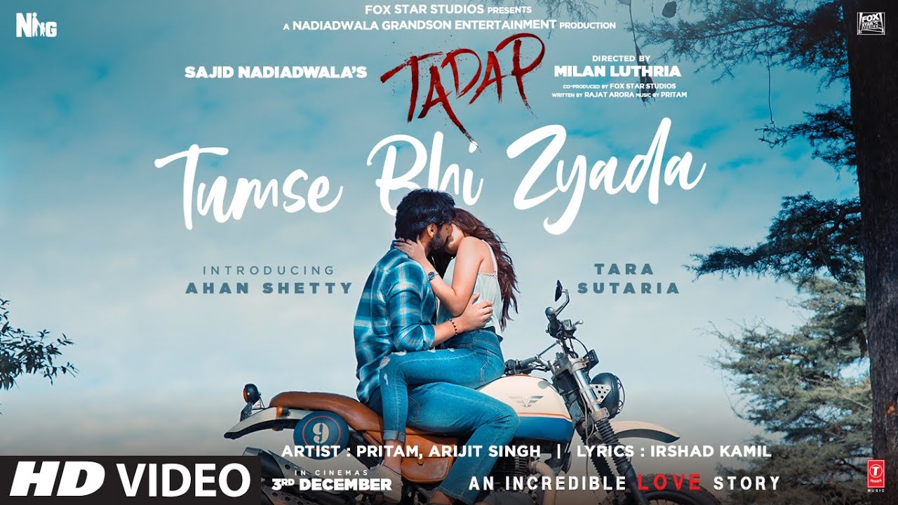 Presenting latest romantic song "Tumse Bhi Zyada" from movie #Tadap Fox Star Studios presents; A Nadiadwala Grandson Entertainment Production "TADAP". Produced by Sajid Nadiadwala directed by Milan Luthria, co-produced by Fox Star Studios, Written by Rajat Arora. Introducing Ahan Shetty. Starring Tara Sutaria, Saurabh Shukla. Releasing on 3rd December 2021. ♪Stream the Full Song Here♪ JioSaavn: https://bit.ly/TumseBhiZyada-JioSaavn Spotify: https://bit.ly/TumseBhiZyada-Spotify Hungama: https://bit.ly/TumseBhiZyada-Hungama Gaana: https://bit.ly/TumseBhiZyada-Gaana Apple Music: https://bit.ly/TumseBhiZyada-AppleMusic Amazon Prime Music: https://bit.ly/TumseBhiZyada-AmazonPrimeMusic Wynk: https://bit.ly/TumseBhiZyada-Wynk Resso: https://bit.ly/TumseBhiZyada-Resso iTunes: https://bit.ly/TumseBhiZyada-iTunes YouTube Music: https://bit.ly/TumseBhiZyada-YouTubeMusic Song Credits: Artist - Pritam, Arijit Singh Lyrics - Irshad Kamil & Ashish Pandit Music Arrangement and Production - Prasad Sashte Sound Design & Additional Music Arrangement and Production - Sunny M.R. Mix & Master - Eric Pillai Chief Sound Engineer - Ashwin Kulkarni Shootmix - Anupam Roy Music Production Manager - Anurag Sharma Vocal Conductors - Akashdeep Sengupta, Dev Arijit, Aniruddh Anantha and Tushar Joshi Sound Engineers - Ashwin Kulkarni, Aniruddh Anantha, Harjot Kaur and Pranav Gupta Mixing Assistant to Eric - Michael Edwin Pillai Sound Engineers at JAM8 - Aaroh Velankar, Subhashree Das, Akash Mukherjee & Abhijit Shesh Musicians Drums - Alan Hertz Guitars - Ridu Shaw Bass - Roland Fernandes Clarinet, Saxaphone and Flute - Shirish Malhotra Violin - Suresh Lalwani Tabla and Dholak - Yusuf Ghulam Mohammed, Mohammed Shadab Yusuf, Sanjeev Sen and Naeem Sayyed Live Dubs Conducted by DJ Phukan and Sunny M.R. ___________________________________ Enjoy & stay connected with us! 👉 Subscribe to T-Series: http://bit.ly/TSeriesYouTube 👉 Like us on Facebook: https://www.facebook.com/tseriesmusic 👉 Follow us on Twitter: https://twitter.